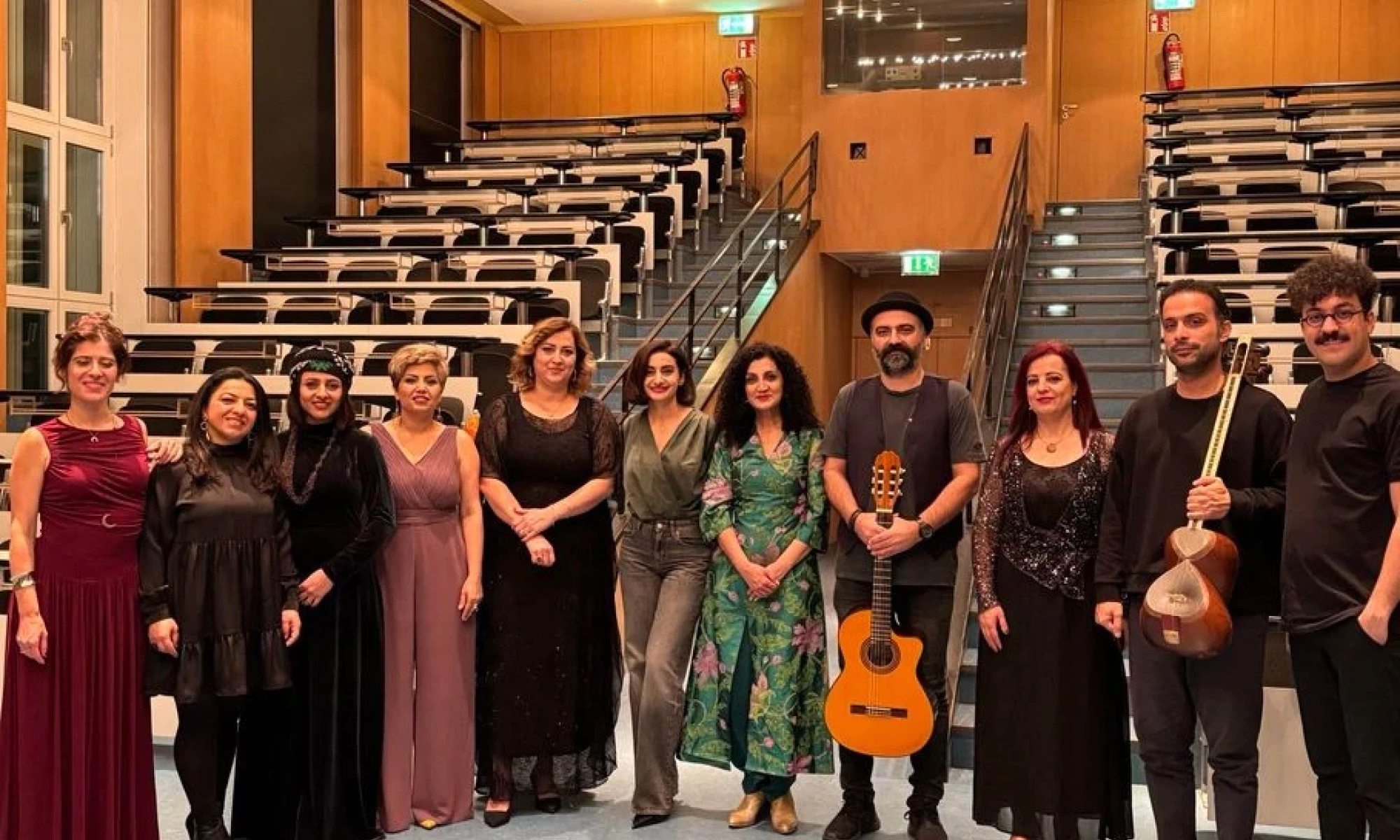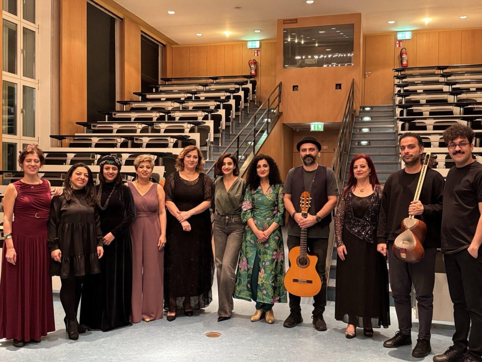 Abgerundet wurde die sprachliche und musikalische Vielfalt des Abends durch Astare Artner und Sheyda Ghavami. Artners „Farewell Song“ ist eine jenseitige, spirituelle Ode in Zaza, einer Sprache, die von der UNESCO als gefährdet eingestuft wird. Ghavami sang ebenfalls in den kurdischen Minderheitensprachen Gorani und Sorani, die beide hauptsächlich in südkurdischen Regionen gesprochen werden. Alle Künstlerinnen kamen für das letzte Lied „Le Gulan“ auf die Bühne, das sie für ein Publikum sangen, das begeistert klatschte und mitsang. Fünf versierte Instrumentalistinnen und Instrumentalisten begleiteten die Musikerinnen durch das vielfältige Repertoire des Abends: Valentina Bellanova an der Ney, Nûrê Dlovani an der Violine, Amirhossein Liaghat an der Daf, Milad Mohammadi an der Tar und Mazlum Rewşen an der Gitarre.